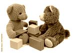 Plüschbären und Holzbausteine vor weißem Hintergrund