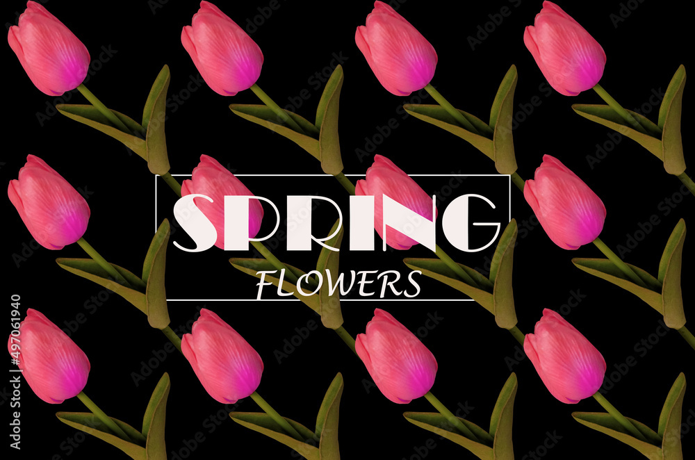 Top view, Made design spring flowers written on it with pink tulips flower isolated on black background for design or stock photo, illustration, tropical summer plant, amity