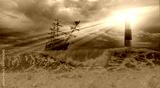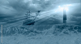 An old sailing ship in the mist sails towards the rocks with amazing lighthouse - Sailing old ship in a storm sea in the background stormy clouds