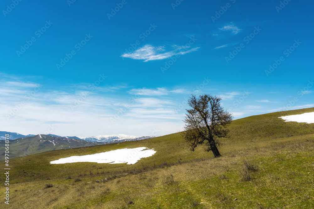 Lonely bare tree on green hills and blue cloudy sky