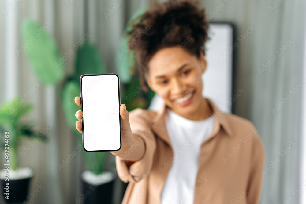 Blurred african american young woman in casual wear, showing modern cell phone with blank white screen, stands at home in a living room, smiling, mockup, copy space concept