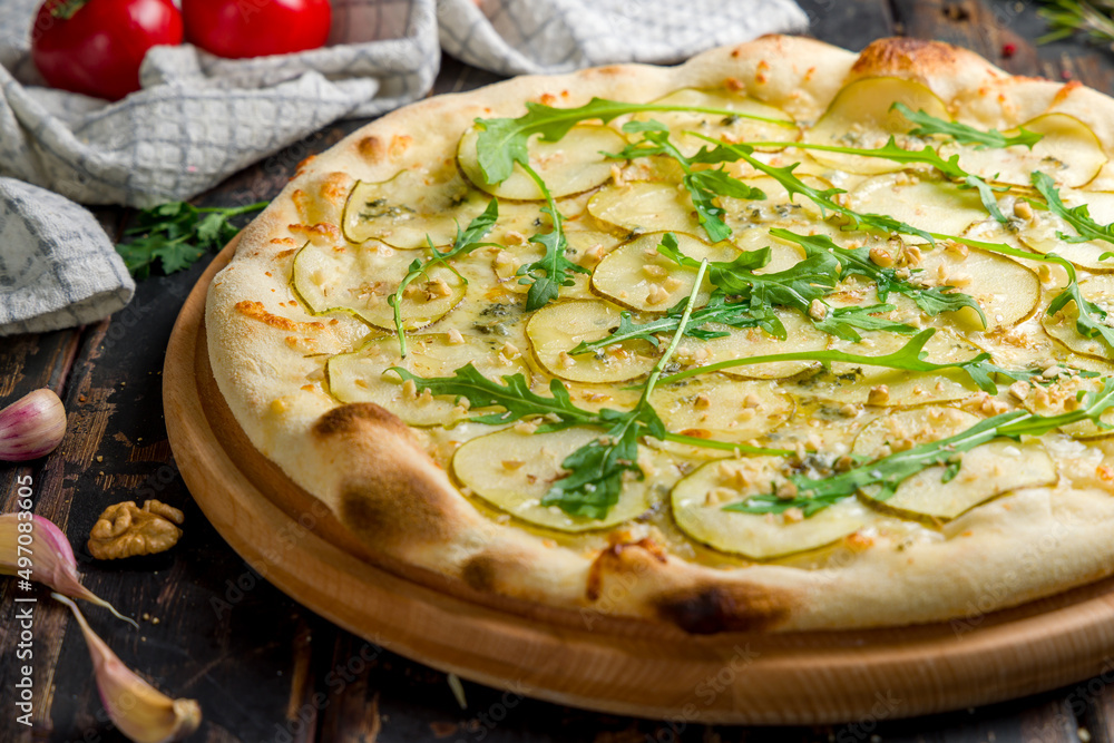 Pizza with pears and Gorgonzola cheese with aragula on old wooden table macro close up