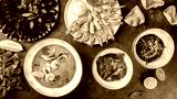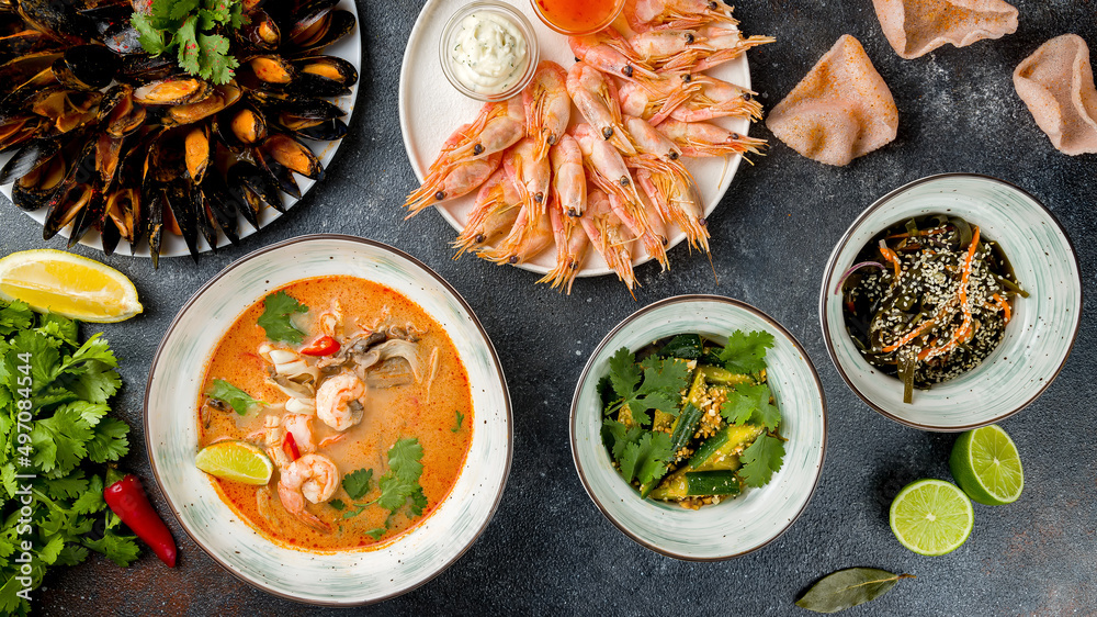Tom Yam soup, boiled shrimps with sauces, mussels in tomato sauce, broken cucumbers, salad with seaweed carrots and sesame seeds top view on dark stone table