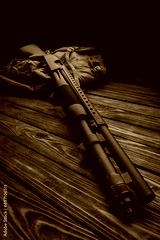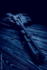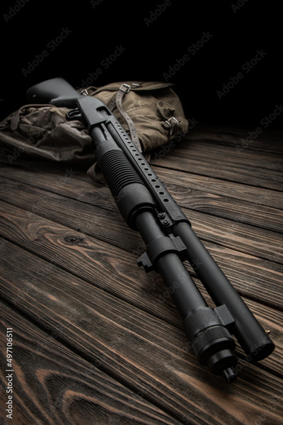 A black 12-gauge pump-action shotgun and ammo are on a canvas backpack. A smooth-bore weapon with a plastic stock. Dark background.