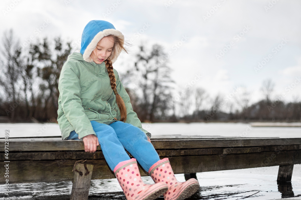 Dreamy child girl sitting on the bridge and soaking rubber boots in the river water. Early spring banner with copy space.