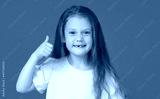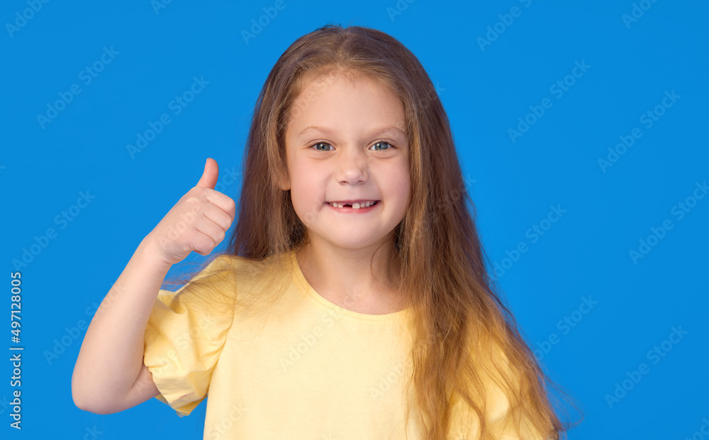 Toothless child. Cute little girl smiles broadly on a blue background. The first milk tooth fell out. thumbs up. The concept of pediatric dentistry and dental hygiene