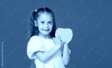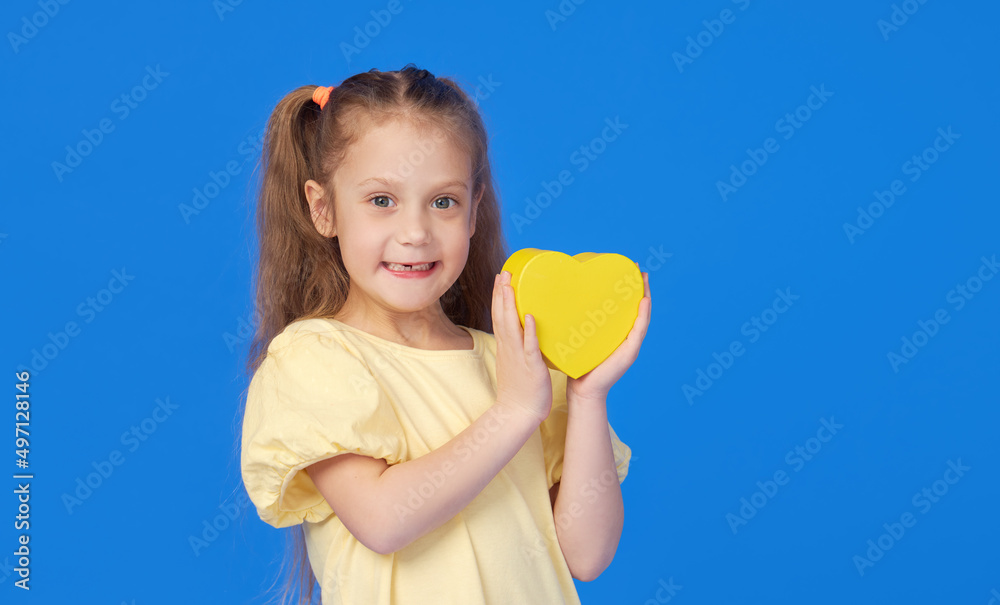 Cute little girl holding a yellow heart in her hands on a blue background. Funny buzzy smile. Little patriot. space for text, advertisement for children's products