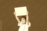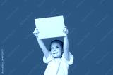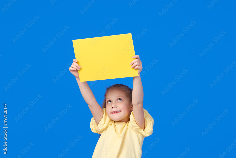 A cute little girl is holding a yellow sign for an inscription on a blue background. Funny face.