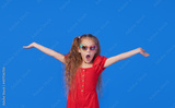 Portrait of surprised cute little toddler girl in the heart shape sunglasses. Child with open mouth having fun isolated over blue background. Looking at camera. Wow funny face