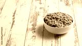 Plate with fresh ground beef on a brown wooden background, space for text, stock photo