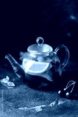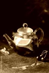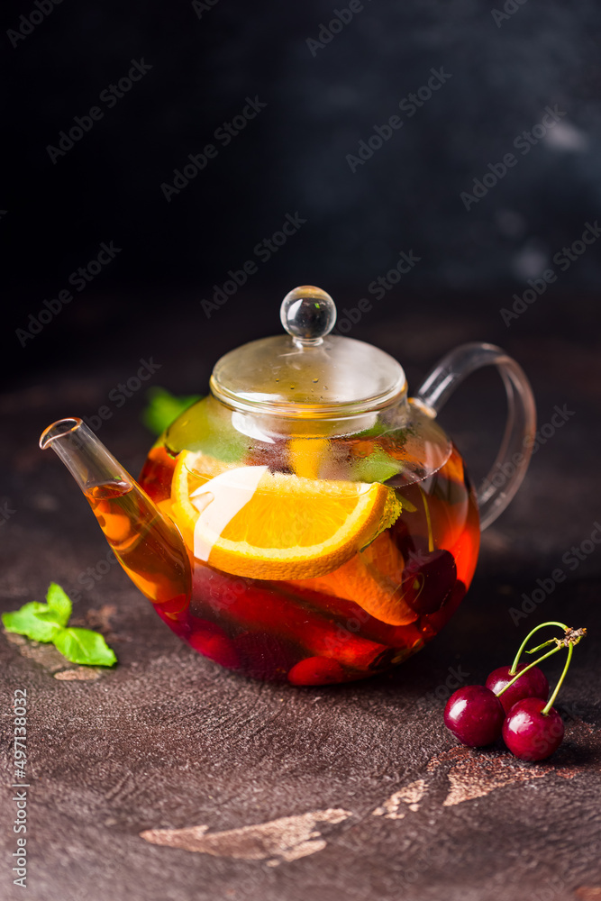 Hot Tea with citrus, mint, cinnamon and fresh berries on dark stone talbe vertical