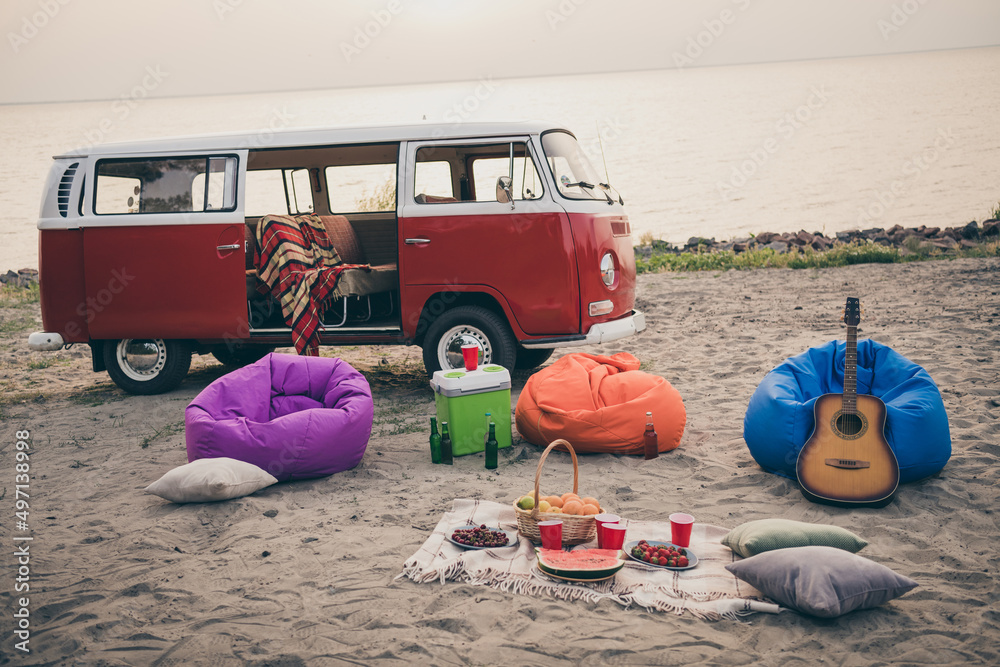 Photo of empty sand beach relaxing peaceful camping location wear boho outfit nature seaside beach outside
