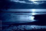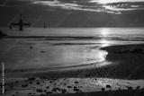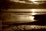 Beautiful sunrise by the sea. The sun reflecting off the talfi water on the sandy beach. A photo with the effect of a long exposure.