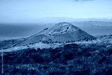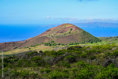 Volcanic crater on Piilani Highway in front of the Pacific Ocean with the West Maui Forest Reserve in the background