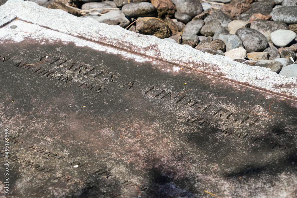 Tombstone of Charles Lindbergh's grave in the cemetary adjacent to Palapala Ho‘omau Congregational Church in Kipahulu on Hana Highway, east of Maui island in Hawaii, United States
