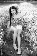 Portrait of asian Young woman happy traveler with black and white pattern dress enjoying in white blooming flower field in the nature garden of in Thailand,travel relax vacation