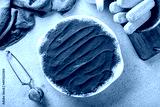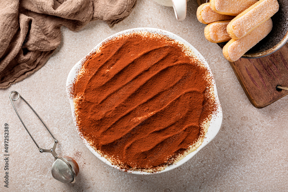 Just made tiramisu, Italian dessert with ladyfinger biscuits, coffee and marscapone cheese in a casserole, powdered with cacao. Homemade. Directly above.