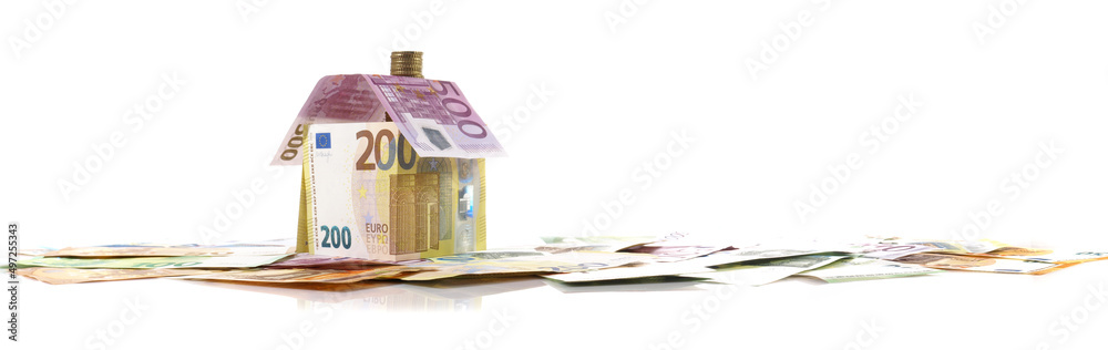 Haus aus Geldscheine, Hauskauf, Kredit - Symbol Panorama Freigestellt