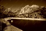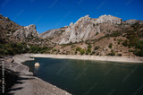 View of the lake in the mountains in summer with vacationing tourists