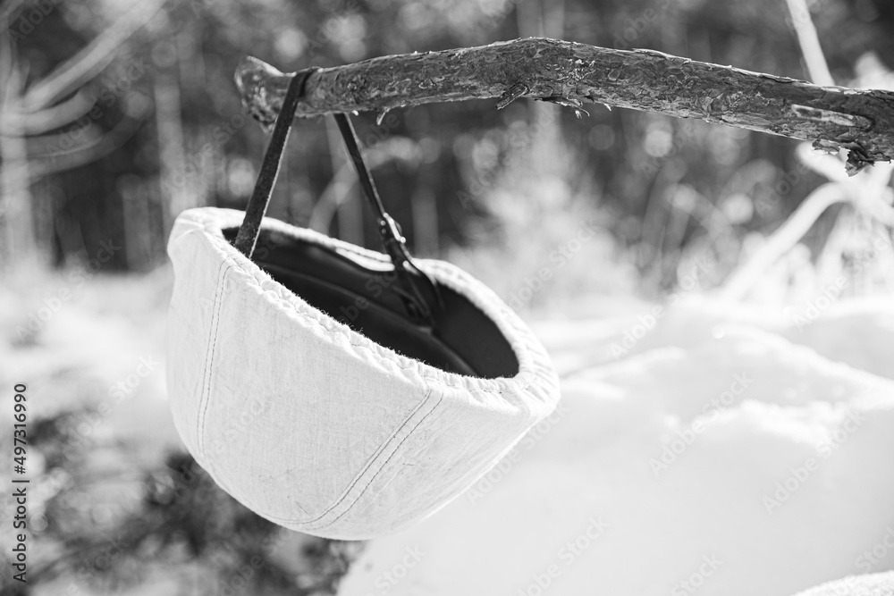 German Wehrmacht Infantry Soldiers White Helmet hanging on wooden banch in snow winter forest. World War II old army equipment ammunition. Metal Helmet Of German Infantry Wehrmacht Soldier At World