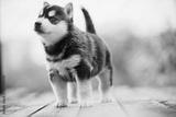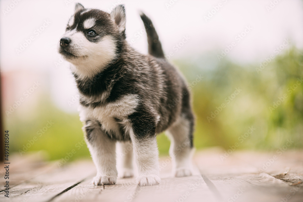 Four-week-old Husky Puppy Of White-gray-black Color Walking On Wooden Ground.