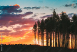 Sunset Sunrise In Pine Forest. Dark Black Spruce Trunks Silhouettes In Natural Sunlight Of Bright Colorful Dramatic Sky. Sunny Coniferous Forest.