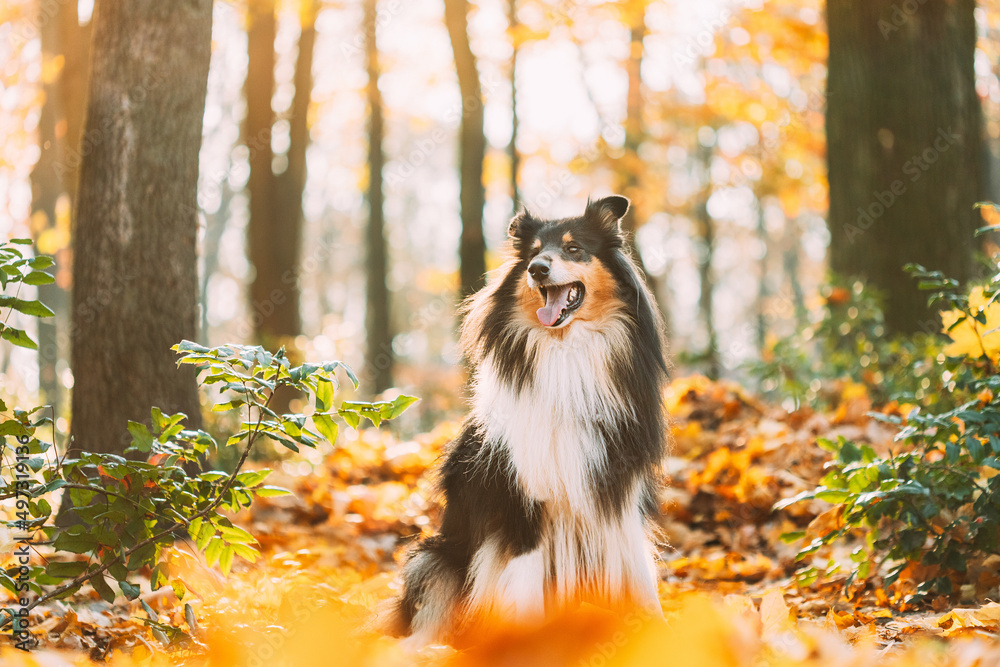 Tricolor Rough Collie, Funny Scottish Collie, Long-haired Collie, English Collie, Lassie Dog Outdoors In Autumn Day. Portrait.