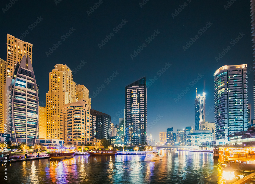 Night view of skyscraper of residential district in Dubai Marina And Tourist Boat, Sightseeing Boat Sailing On Dubai Marina.