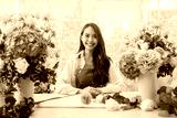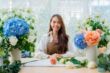 portrait Asia Female florist smile arranging flowers in floral shop. Flower design store. happiness smiling young lady making flower vase for customers, preparing flower work from home business
