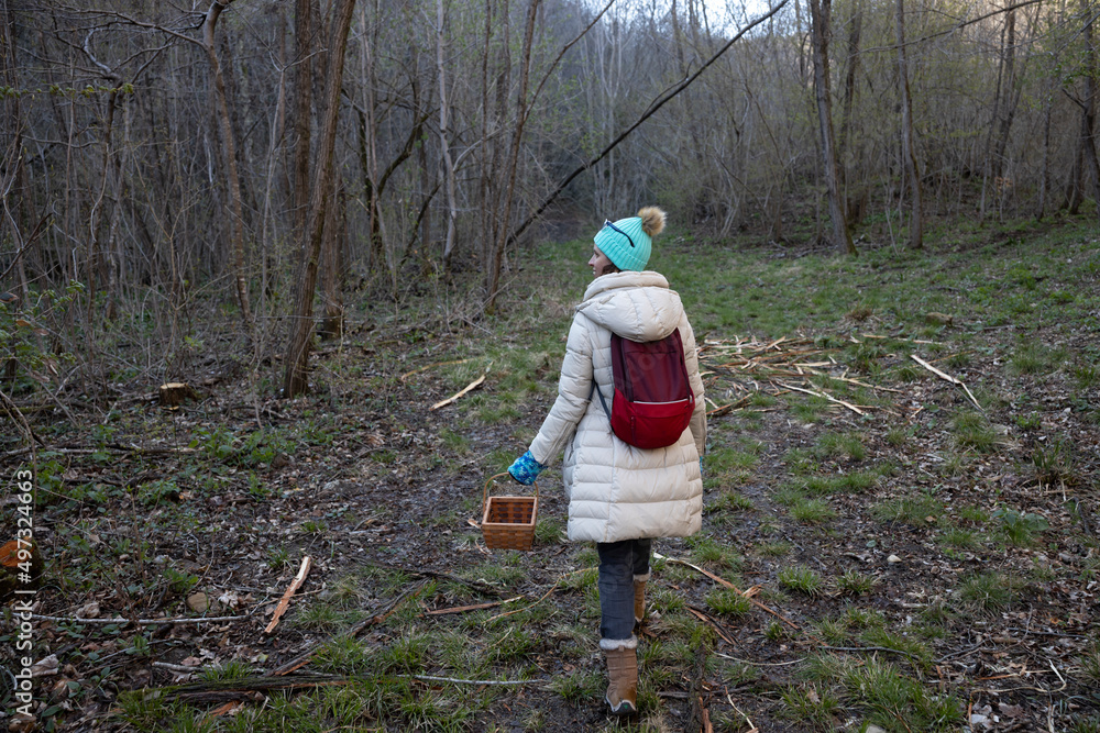 Woman Walking in A Forest and Picking Wild Garlic Plant Leafs in Woodland
