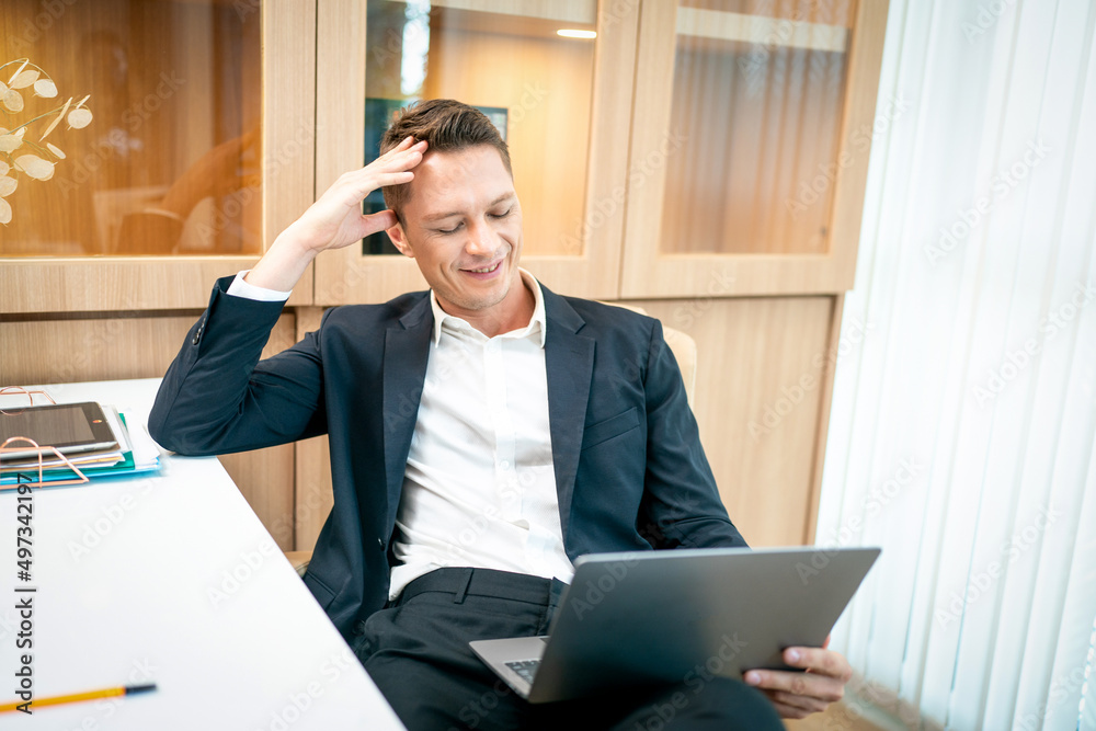 Businessman looking at a computer monitor during his working day in the office. Business and success concept