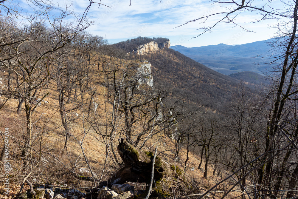 Sunrise and morning sunrise in the mountains panoramic view from the site located on the ridge of the tourist route.