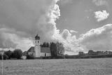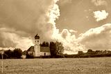 Typische oberbayerische Kapelle mit Gewitterwolken im Hintergrund, Deutschland.