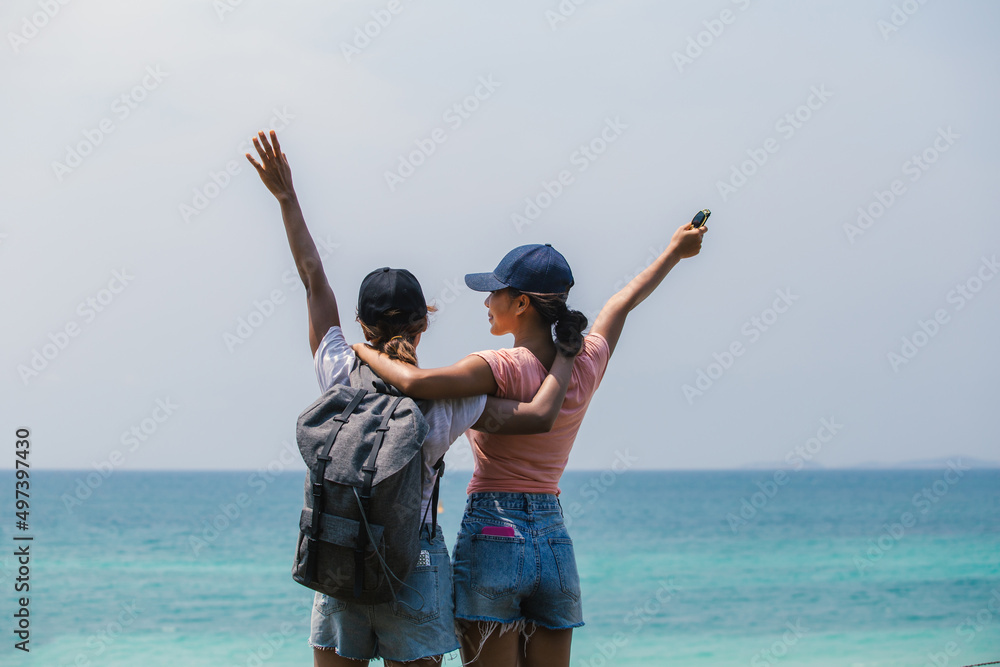 Two Asian female lovers on summer vacation on coast of the sea in concept of freedom of happiness, female tourist on summer vacation on a clear day.