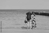 young couple walking on the beach of the Baltic Sea near Kolobrzeg in Poland