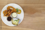 Set of chicken steaks in a white plate is placed on a brown wooden floor.
