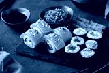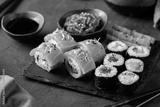 Vegan Sushi, Sashimi and Maki Rolls with Plant based seafood