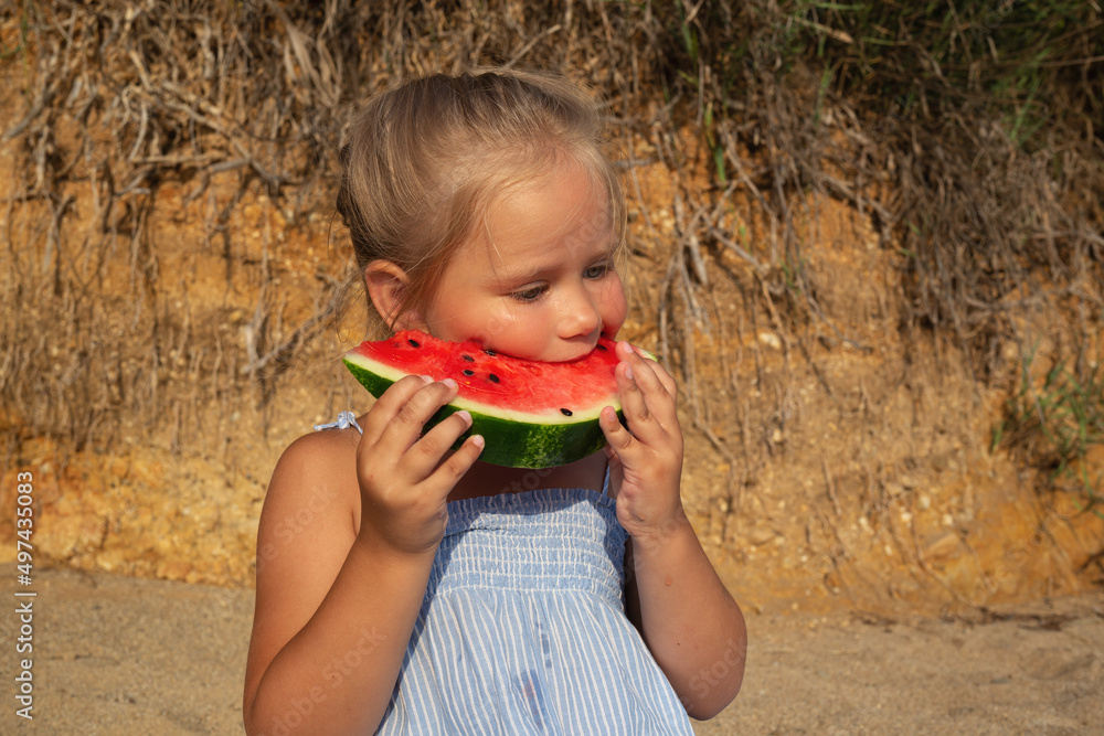 little cute girl eating watermelon sitting on the beach at sunset