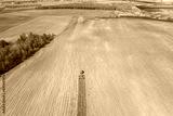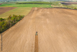 Aerial View. Tractor Plowing Field In Spring Season. Beginning Of Agricultural Spring Season. Cultivator Pulled By A Tractor In Countryside Rural Field Landscape.