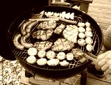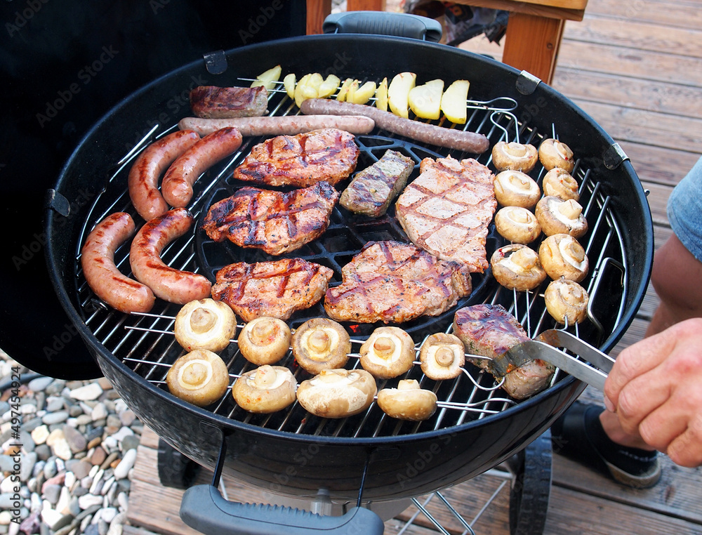 Men is grilling Meat, Sausages and Mushrooms