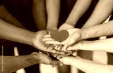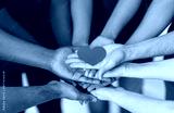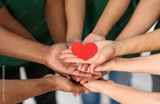 charity, support and volunteering concept - close up of volunteers's hands holding red heart at distribution or refugee assistance center