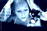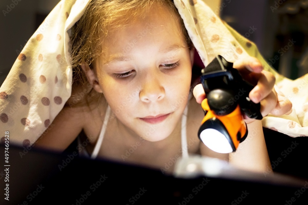 Cute little girl hides under a blanket and reads a fairy tale about a magical space world