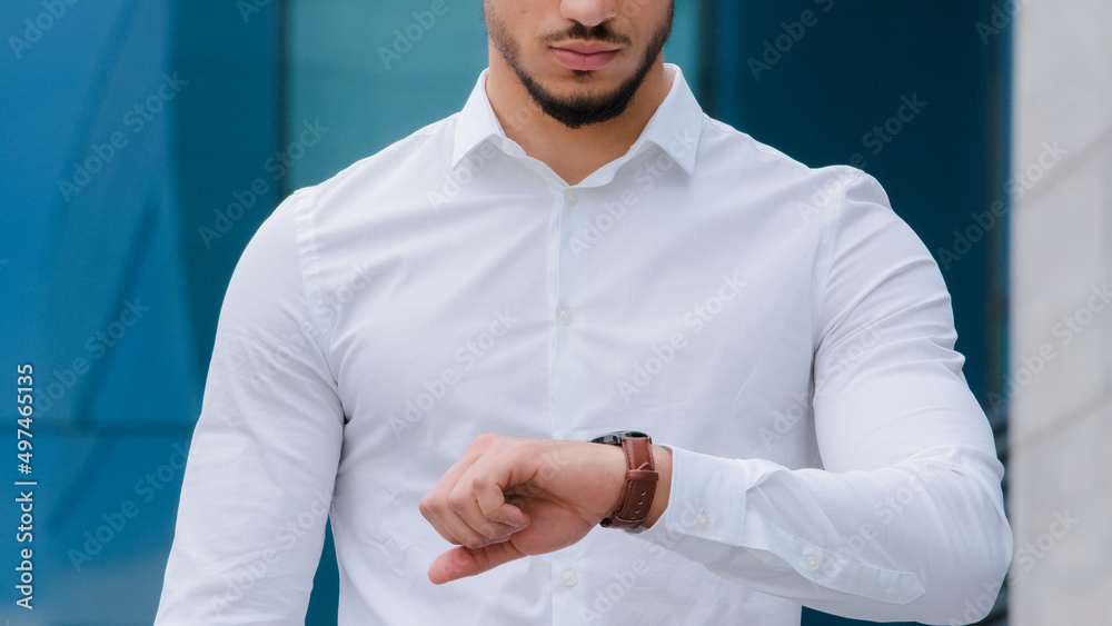 Unrecognizable arabic Hispanic business man with beard young boss leader manager wears white formal shirt looks at wrist watch angry of late time lateness checks hour waving head no negative upset