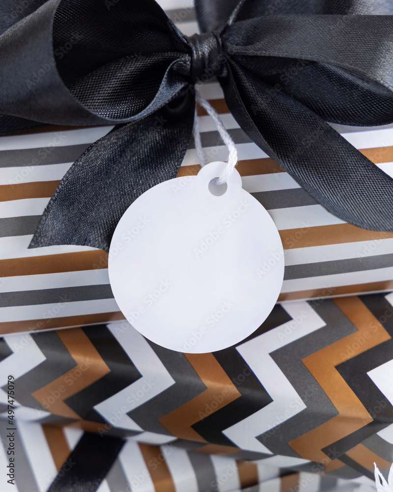 Wrapped present with round blank gift tag and black bow close up, label Mockup