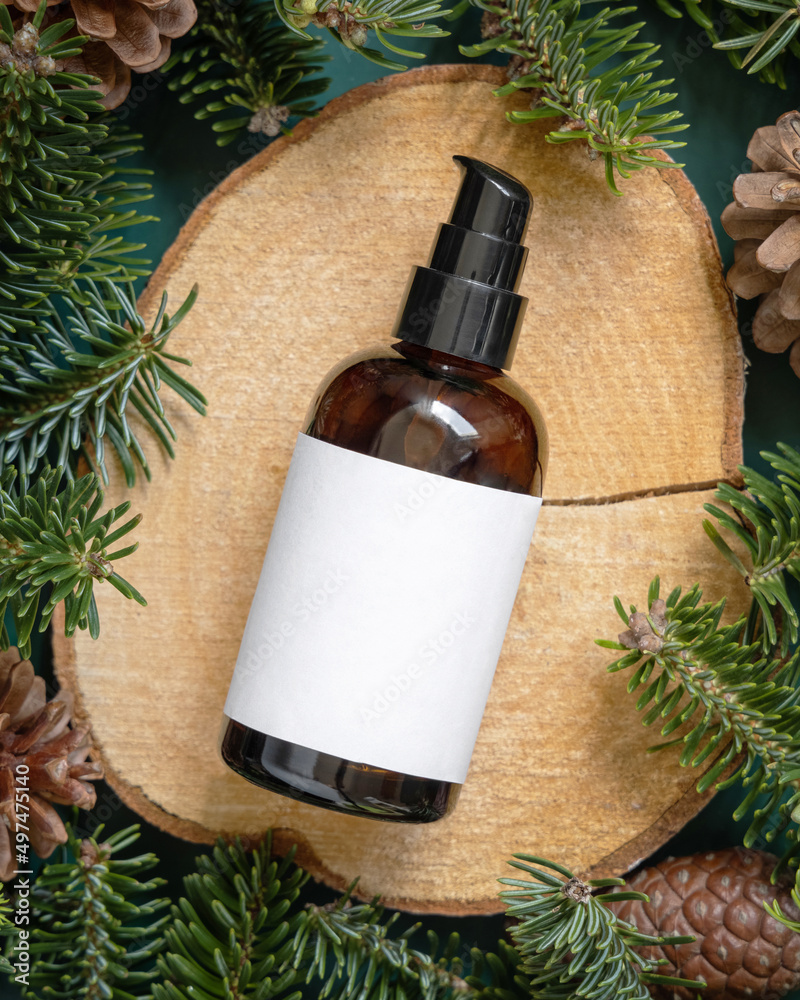 Brown glass dispenser between fir branches and pine cones on wooden piece top view. Mockup.