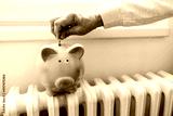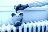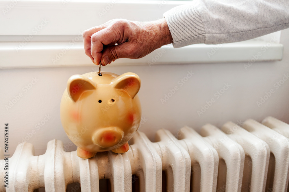 Close-up of a man hand inserting coin in piggy bank on radiator at home. Piggy bank with money on radiator at home. Heating, energy crisis and consumption concept.