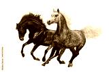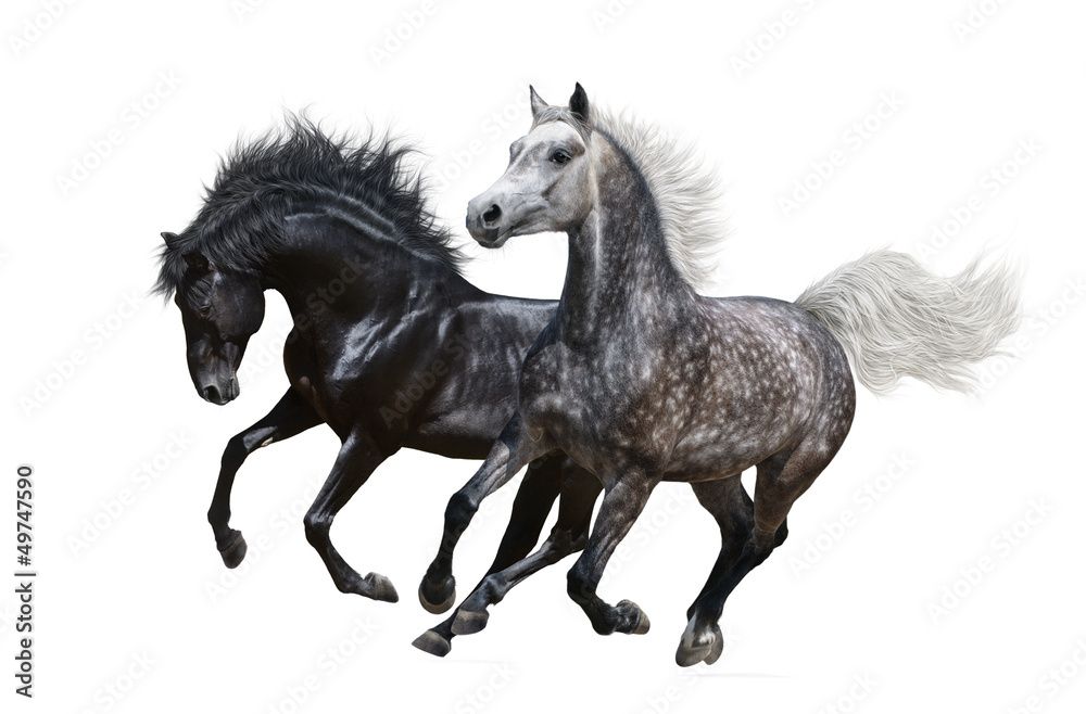 Two horses gallop on white background