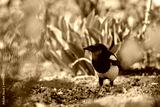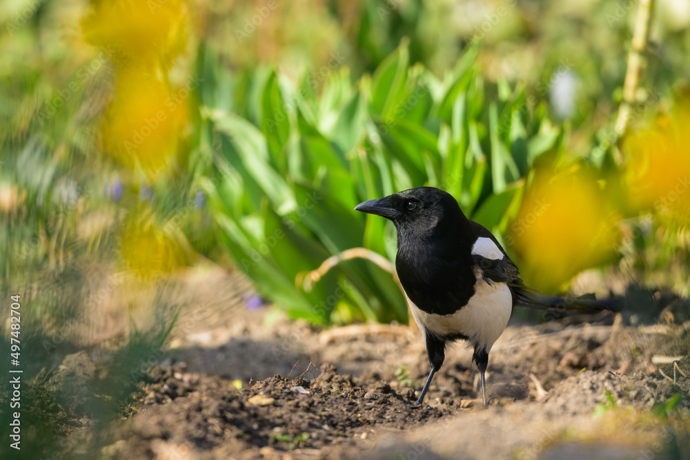 A common magpie walking and searching for nesting material in the garden