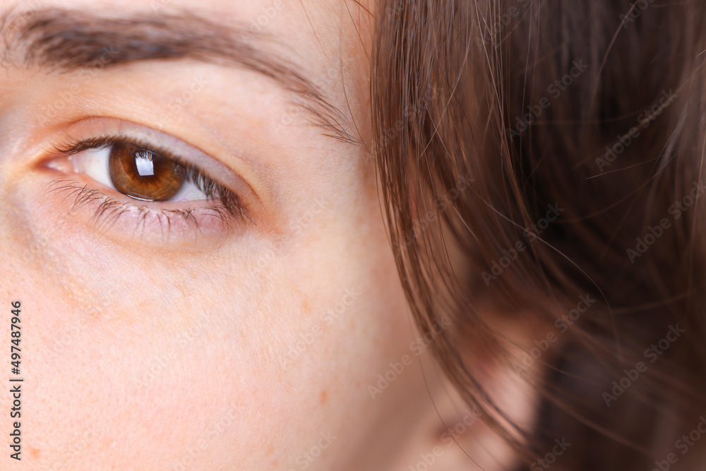 Close-up of a woman's face without makeup, natural beauty. A girl with brown eyes and hair looks away.
