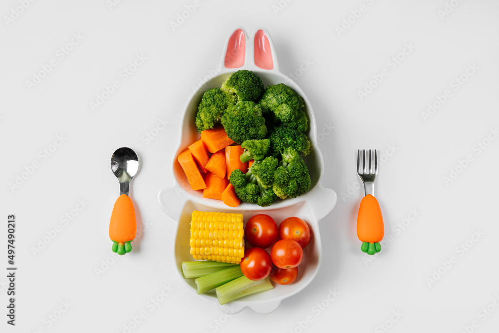 Cute plate in the shape of a bunny with fresh vegetables. Food idea for kids. Children's healthy food with carrot and broccoli
